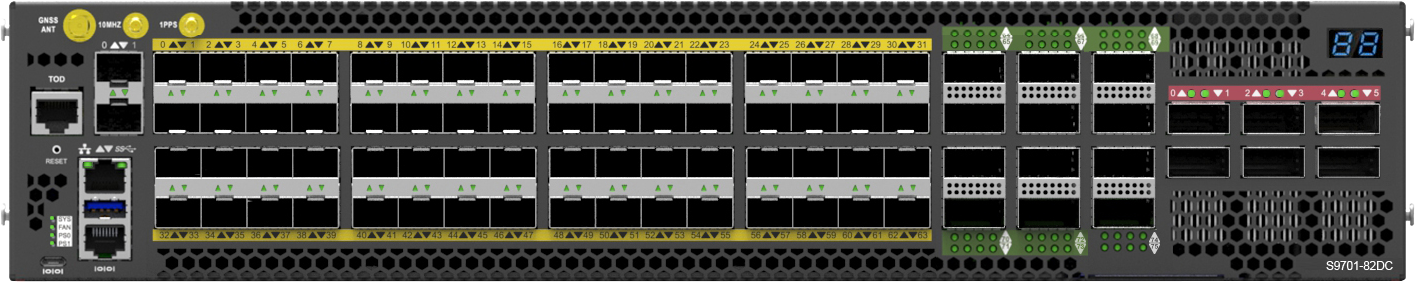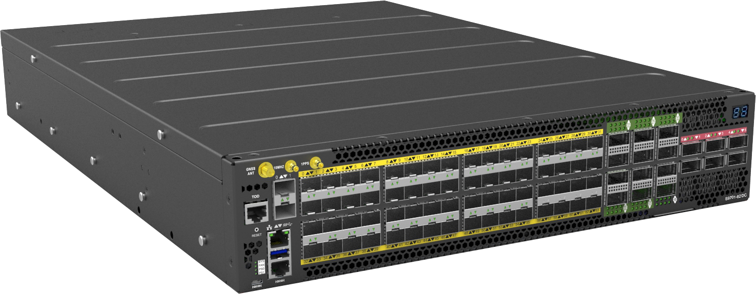 S9701-82DC 分解構式核心路由器採用Broadcom J2C 晶片組,提供 4GB 深度緩衝區,1000Mpps 封包處理量和 2.4Tbs 交換流量。選配的知識型處理器 (或 TCAM) 可以同時進行 16 個並行搜尋,每秒可完成數十億決策,是服務供應商佈建邊緣網路的最佳選擇。 S9701-82DC 配置了完整的時間同步埠口(GNSS, 100MHz, 1PPS 及 ToD),支援 IEEE1588v2 和 SyncE 並符合 Class C 精準度規範,適用於現代網路的各式應用。